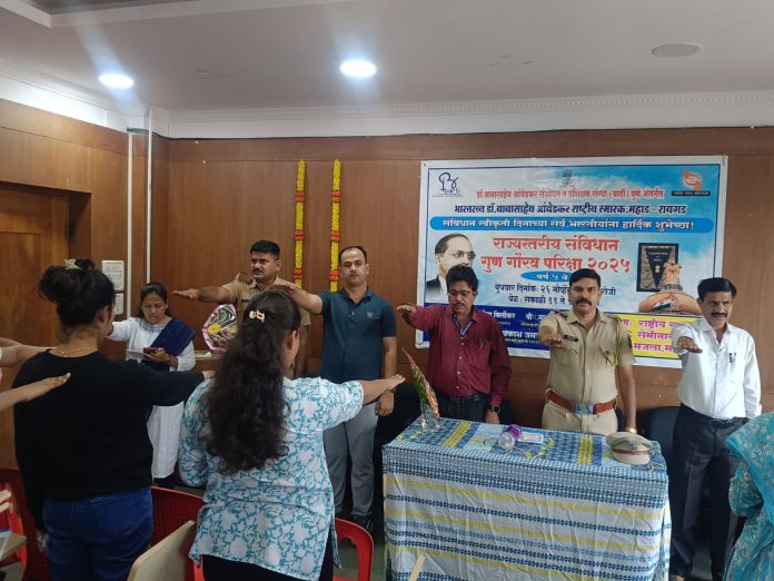 संविधान गुण गौरव समिती व भारतरत्न डाॅ.बाबासाहेब आंबेडकर राष्ट्रीय स्मारक महाड यांच्या संयुक्त विद्यमानाने राज्यस्तरीय संविधान गुण गौरव परीक्षेचे आयोजित २६ नोव्हेंबर २०२५ रोजी करण्यात आले होते. त्याचा बक्षीस वितरण समारंभ राष्ट्रीय स्मारक येथे पार पाडण्यात आला. तरी या कार्यक्रमासाठी प्रमुख पाहुणे म्हणून महाड शहर पोलीस ठाण्याचे पोलीस निरीक्षक मा.श्री.रमेश तडवी सर,तसेच तांत्रिक विभागाचे (बार्टी पुणे) मा. श्री. राजेंद्र वाबळे सर,पोलिस विभागाचे श्री.राम कांदे व श्री.राहुल येळे,राष्ट्रीय स्मारकाचे व्यवस्थापक श्री. प्रकाश जमधाडे सर,माहिती व जनसंपर्क अधिकारी लिना किर्तीकर उपस्थित होते. कार्यक्रमाची सुरुवात दीप प्रज्वलनाने होवून संविधान प्रास्ताविकेचे वाचनाने झाली.प्रमुख पाहुणे मा.तडवी सरांनी स्पर्धा परिक्षा करणार्या विद्यार्थ्यांना चांगले मार्गदर्शन केले.राज्यस्तरीय संविधान गुण गौरव परीक्षेमध्ये सर्वाधिक गुण मिळवून प्रथम क्रमांक यश अनिल जाधव,दुसरा क्रमांक आप्पासो वसंत लवटे, तृतीय क्रमांक ओम एकनाथराव झाकर्डे या विद्यार्थीनी मेडेल पटकावले.सर्व सहभागी विद्यार्थींना प्रमाणपत्र देवून गौरवण्यात आले.दरवर्षी संविधान गुण गौरव परिक्षा सहभागी म्हणून भारतरत्न डाॅ.बाबासाहेब आंबेडकर राष्ट्रीय स्मारक,महाड यांना प्रमाणपत्र देवून सन्मान करण्यात आला. तसेच निस्वार्थ सेवेसाठी केंद्रप्रमुख लिना किर्तीकर यांना देखिल सन्मानचिन्ह व प्रमाणपत्र देवून गौरवण्यात आले. या परीक्षेसाठी राज्यभरातून भरपूर प्रतिसाद मिळाला. विद्यार्थ्यांमध्ये संविधान जनजागृती महत्व पटवून देणे हा एकमेव उद्देश डोळ्यासमोर ठेवून संविधान गुण गौरव परिक्षा दरवर्षीप्रमाणेच यंदा ही पार पाडण्यात आली. कार्यक्रमाचे सूत्रसंचालन माहिती व जनसंपर्क अधिकारी लिना किर्तीकर यांनी केले.कार्यक्रमासाठी सुजाण नागरिक मंच व संविधान गुण गौरव समितीचे संविधान प्रचारक मा.श्री.विलास पवार व मा.श्री.नुरखाॅ पठाण यांचे मार्गदर्शन लाभले. या कार्यक्रमासाठी स्मारकातील सर्व कर्मचारी ग्रंथालयातील विद्यार्थ्यी या कार्यक्रमासाठी उपस्थित होते.लिना किर्तीकर यांनी आभाराने कार्यक्रमाची सांगता झाली…